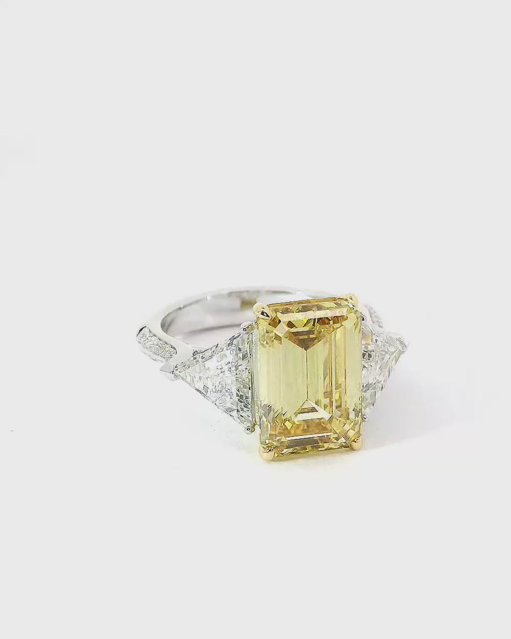 Objměte si zářivé teplo tohoto prstenu z 18karátového zlata, kde oslnivý žlutý diamant – broušený do smaragdového tvaru pro bohatou hloubku a svit – dominuje v centru, doprovázený dvěma trojúhelníkovými bílými diamanty, které jeho živou energii ještě zesilují, s jemným rozptylem melee diamantů pro extra lesk. Jako uvědomělý honosný znak odráží vaši jedinečnou stezku optimismu a proměny, jeho slunečný žlutý odstín probouzející radostnou vitalitu, která vás pohání procházet životními kapitolami s trvalou ladností. Ideální pro vizionáře pátrající po kouscích překonávajících sezónní vrtochy, kde se ekologicky inspirovaná noblesa snoubí s nedotknutelným objetím zlata a vyřezává hluboké, zářivé dědictví.
